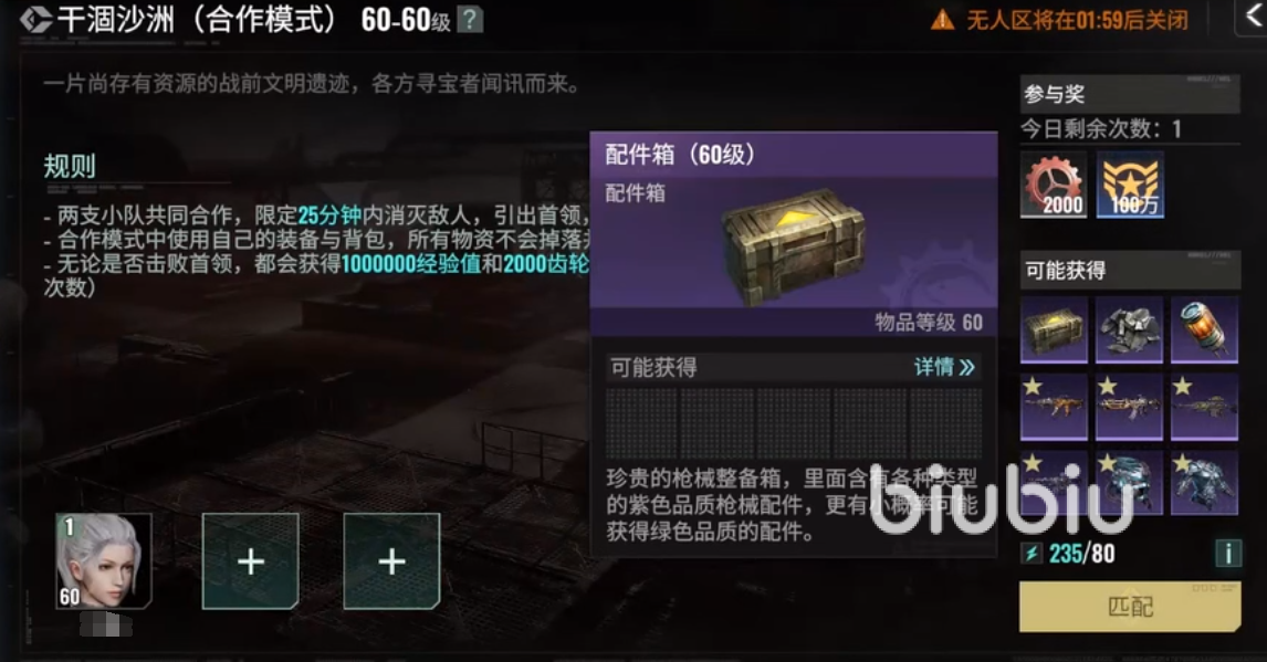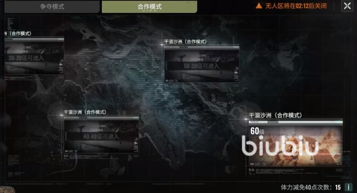 无人区位于干涸沙洲,每天在13:00~15:00、19:00~23:00两个时间段内的整点开放,每次开放25分钟,不限制每日参加的次数。但是玩家参与活动会消耗体力,系统每天会赠送体力减免的次数,参与合作模式的时候自动体力减免40点,周一到周五每天一场,周末两天每天两场,没有消耗的体力减免次数最多可以累积15场,而且好消息是累计次数与争夺模式共享。