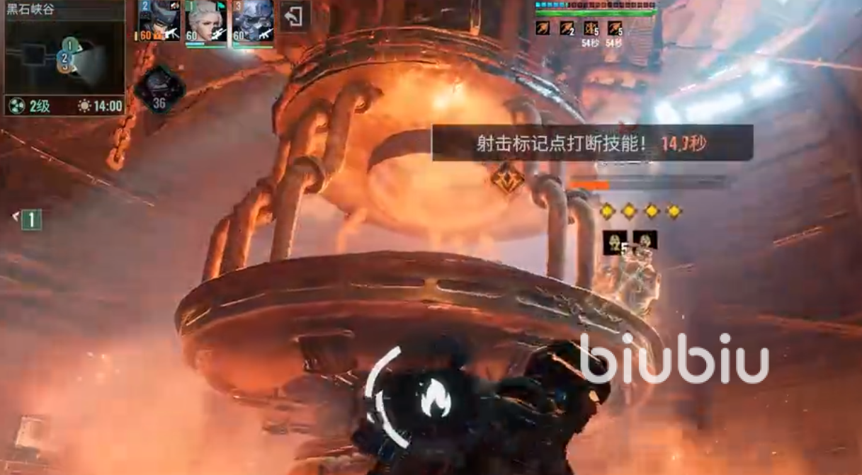 嘎拉泰掉到1/4血时期有高威胁技能, Boss跳到地图中央冷却槽中,系统会提示玩家攻击标记点打断技能,此时必须放下手头工作的集体攻击,在14秒限时内打断boss技能,顺利的话可以直接了结。