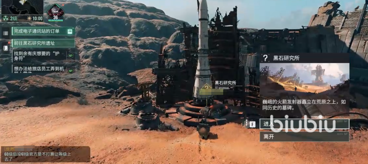 挑战黑石研究所遗址副本,最多可以邀请两位队友共三人进入,当然玩家也可在线匹配,无需拉人。首次进入该地图的玩家,推荐顺便做主线的任务,先找到与有幸想要的护身符,其次为旅店员工弄到机器人的零件。在星铁城正式进入黑石研究所的位置位于火箭发射器,沙漠背景上比较好找,点击即可进入。