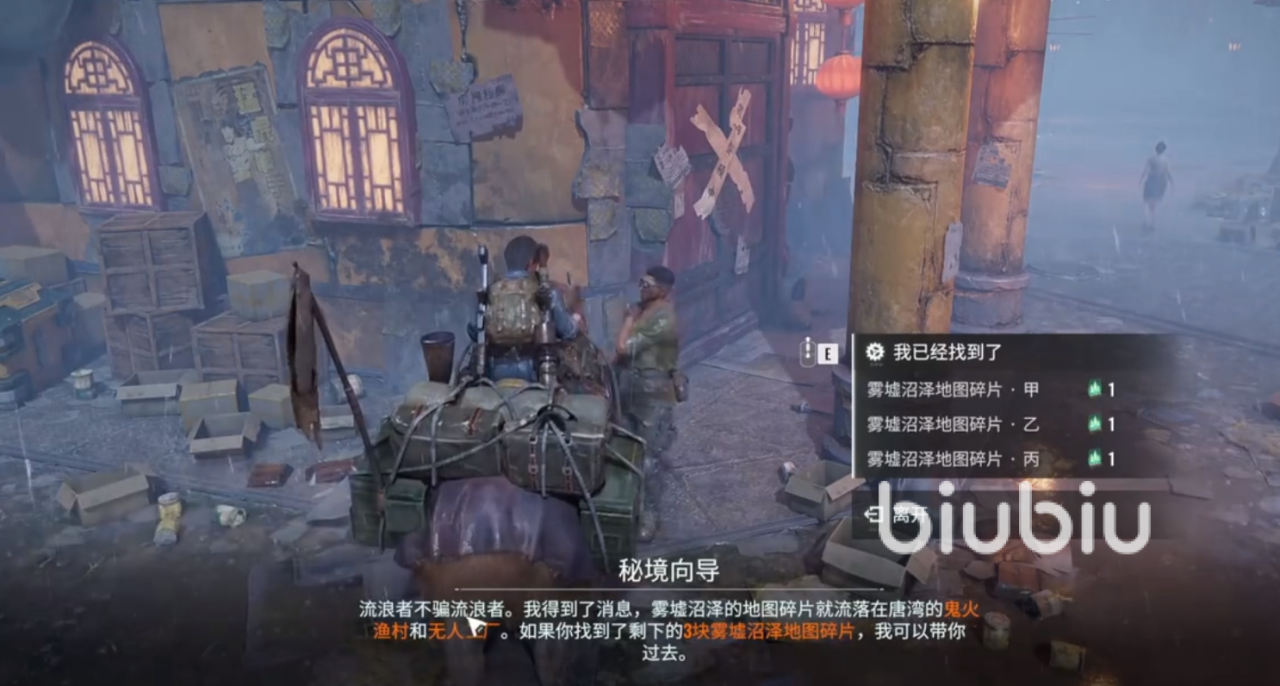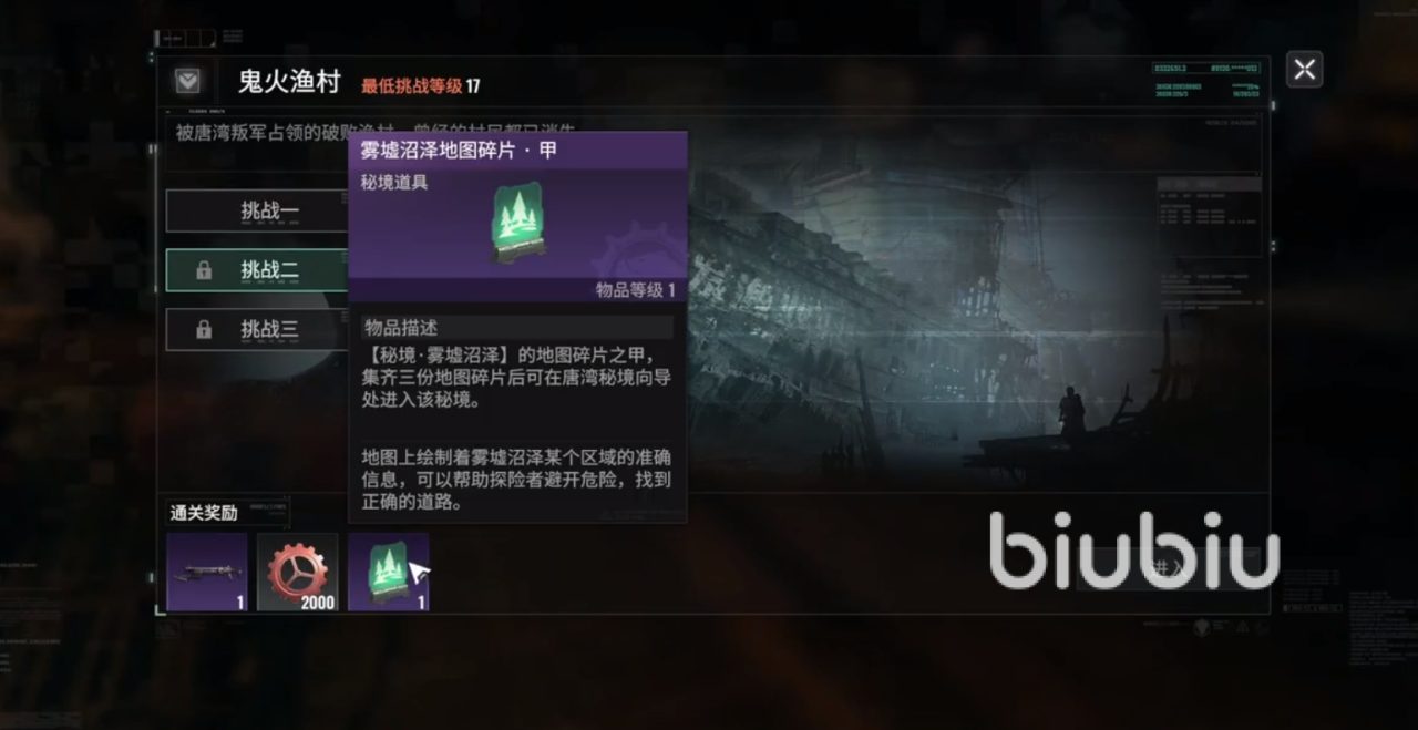 接下来在虾尾荡右手边,解锁第2个挑战鬼火渔村,可以获取通关奖励唐湾老炮,这是把紫色的半自动霰弹枪,是可以打前期大部分地图的强力喷子。而且还有关键的道具雾墟沼泽地图碎片,集齐三张,就能开启雾墟沼泽。