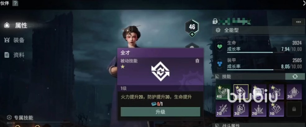 追求火力的话有4个技能是必带的,就是那种有星星标记的技能。包含全才、领袖、全能、天才。全才给20点火力,还有防护和生命提升。领袖是加4%火力、防护、生命、装甲。全能是用副手的时候主角全属性提升3。