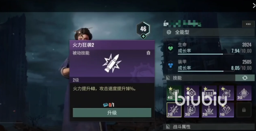 猛攻也很适合提升火力,而且提升幅度最大,足足有60点。火力全开,6%火力提升。火力狂袭,其中火力狂袭2可以给到40点火力提升和16%的攻击速度提升。英勇也很不错,用副手打时候主角力量加12点。