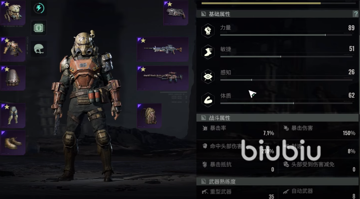 打开属性面板可以看到,每一个角色除了等级之外,还有力量、敏捷、感知、体质这几种基础属性。每一种属性都有相应的影响,力量是影响重型武器的火力,每1点力量可以提升1点重型火力,3点力量则提升1点自动或半自动武器火力。