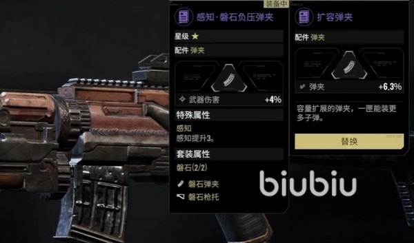 比如说“扩容弹夹”可以提升一定百分比的弹夹属性,“突击枪托”降低武器精准度但提升伤害,适合喜欢玩冲锋枪的玩家,“负压弹夹”加火力,“六倍镜”除了加属性外还可以在瞄准后放大6倍。