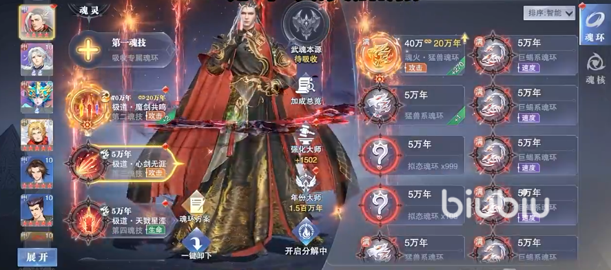 先看他的第一魂技”极道·尘灼八荒”,对敌方所有敌人打出6段82.5%基于自身攻击力的伤害,招式使用后自己会进入1重”无间尘劫”,每重使用第1魂技造成的最终伤害永久提升20%,最高可叠加77重,这个技能削减意志值,削弱量等于自己初始精神力的20%。