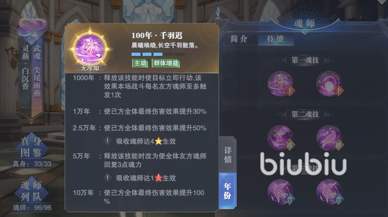 4星解锁120万年,效果变为提升200%所有队友永久最终伤害,达到5星解锁200往年,释放该魂技会额外给所有队友施加上“燕影”,并使得队友受到的魂技伤害降低50%,持续1回合。
