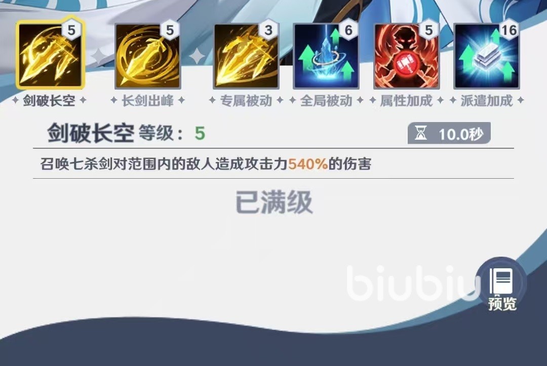 尘心是属于上三宗羁绊的输出角色,他的随机攻击和范围伤害,在很多战斗中都表现的非常出色。第一个技能剑破长空,召唤出七杀剑,对范围内的敌人造成540%攻击力的伤害。如果仅以伤害比例而论,此技能当属游戏中的最强伤害技能。第二个技能长剑出锋,释放四把飞剑随机攻击敌人,每把剑可以对目标造成72%攻击力的伤害。