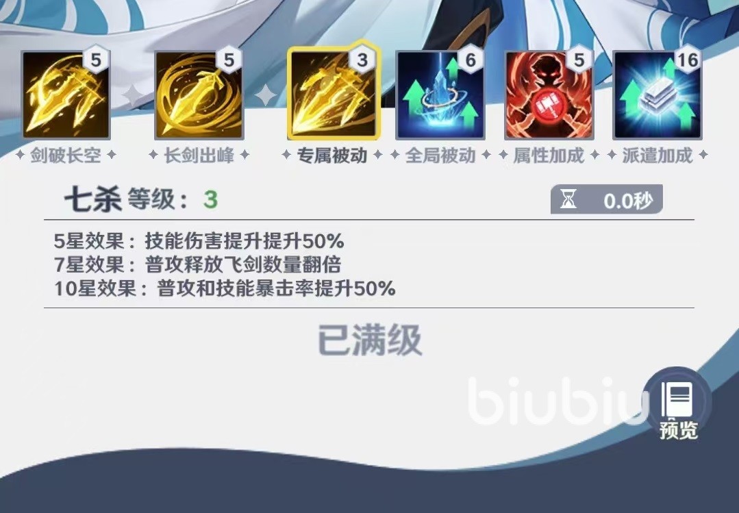 专属被动七杀,在五星时效果是技能伤害提升50%。七星时的效果是普攻释放的飞剑数量翻倍,飞剑数量翻倍,当然造成的伤害也翻倍,而且可以触发更多的暴击。10星时的效果是普攻和技能的暴击率提升50%。可以说达到10星的尘心才是真正强势,几乎可以做到必定暴击非常残暴。全局被动剑道无双。尘心的无双剑气会削弱敌方防御,在主线推图玩法中,所有魂师造成的伤害增加18%。所以尘心是非常适合用来主线推图的主力输出,有了这样的被动,整个团队的伤害都大幅度提升。在派遣方面,派遣到铁匠铺的时候有额外的加成。