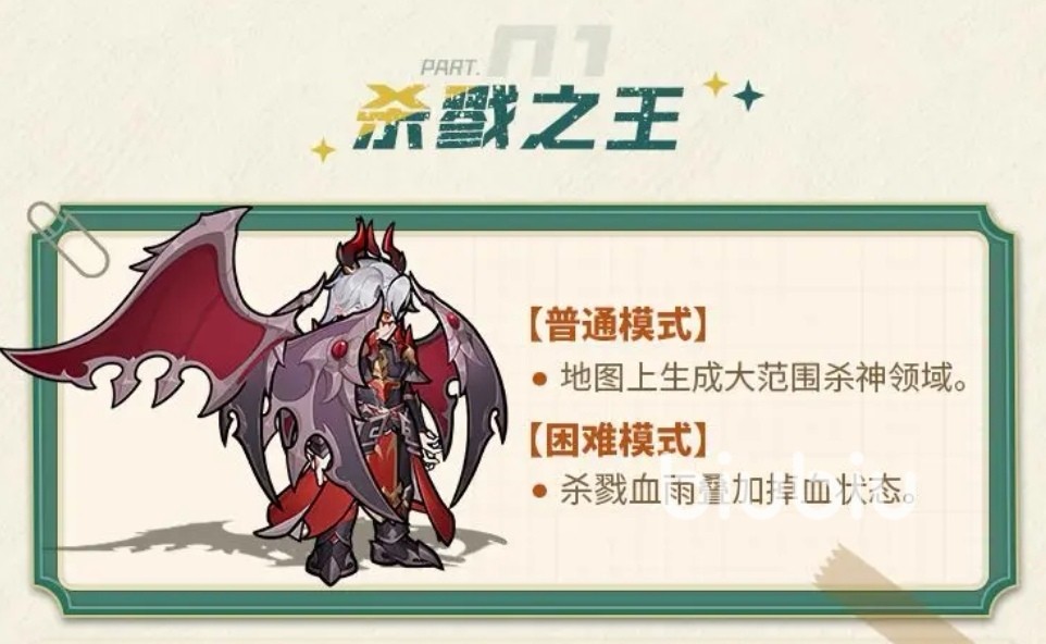 第五位要介绍的是杀戮之王,普通模式下的它会在地图上生成大范围的杀神领域,处于困难模式中的它会在杀戮血雨中叠加一个掉血状态。解决这个boss是需要玩家躲到没有杀神领域的安全范围内,而困难模式下,由于杀神领域的扩大,小编建议大家再带个辅助角色进行回血比较保险。