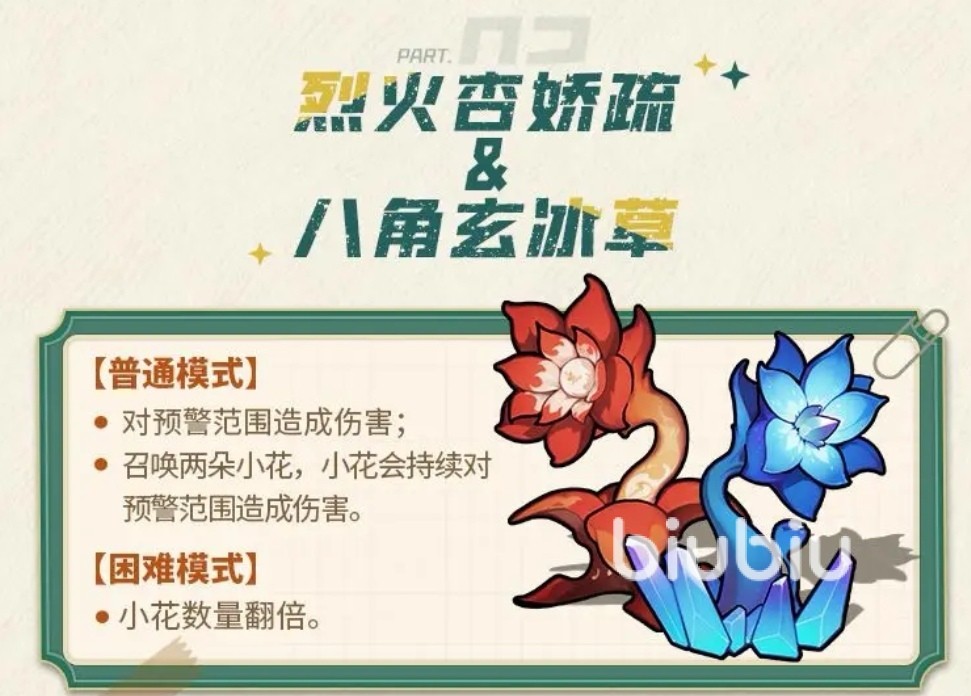 第六位要介绍的是烈火杏娇疏&八角玄冰草,普通模式下的boss会对预警范围造成伤害并召唤出两朵小花,小花们会不断地进行攻击,到了困难模式,boss召唤的小花数量会增多。玩家想要击败boss的话,除了躲避预警技能之外,就是去优先消灭小花,降低伤害。