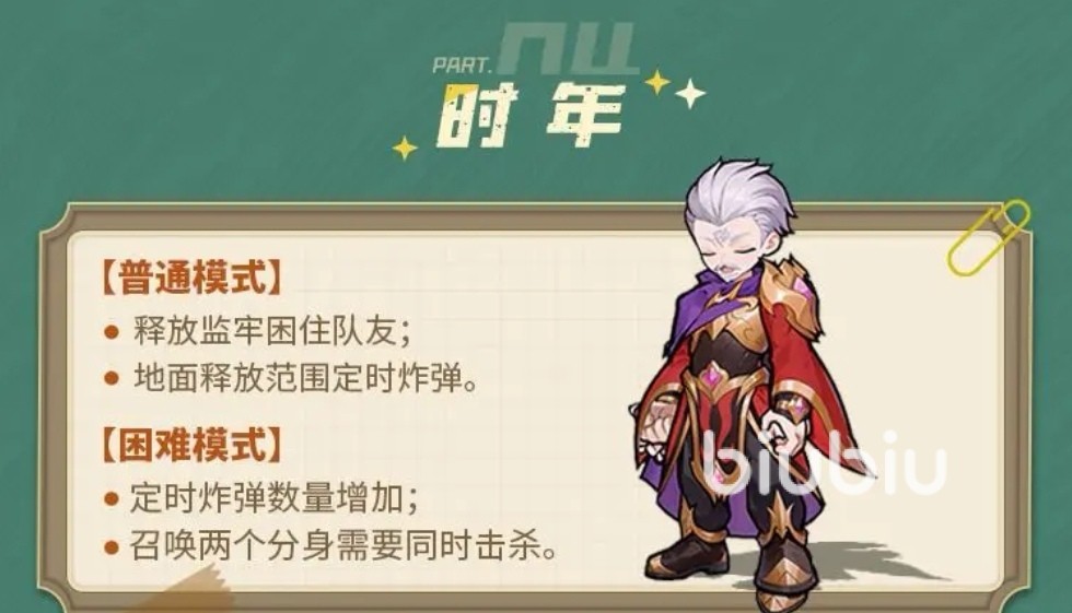 第四位要介绍的是时年,普通模式下的时年会制造出一间牢狱来控制队友,地面释放出几颗范围性定时炸弹,在困难模式中,时年会增加定时炸弹的数量并召唤出两个分身。击败时年的技巧就是要躲避预警技能,及时打破监牢救出被困的队友,困难模式的话,要先把两个分身打成残血,再一石二鸟。