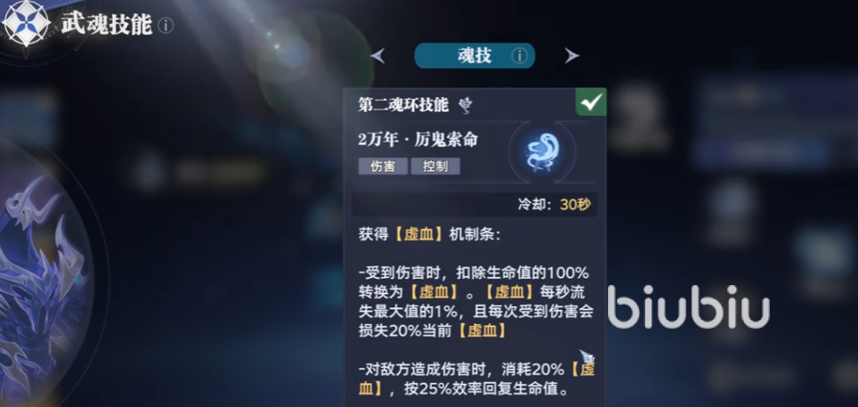 如果主动使用的话就可以让鬼魅附体,之后我们可以造成伤害,并且按照比例化为虚血。就是说伤害越高,你的回血量就越充足。魂环年限的附加效果就是吸魂,可以让你更快的回复魂力。