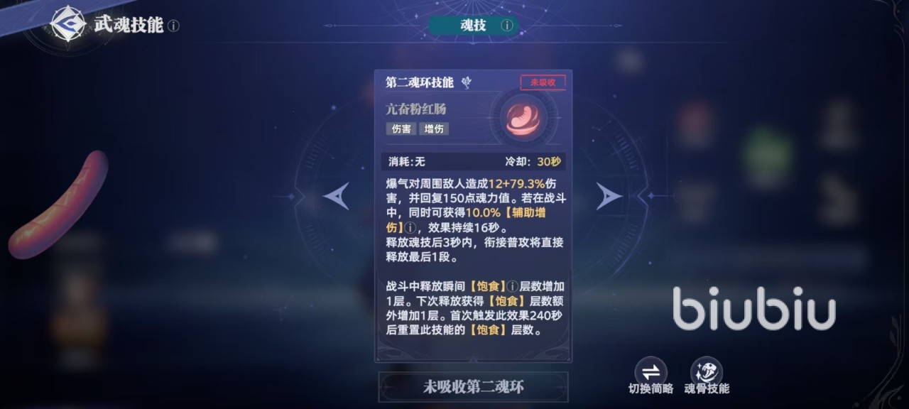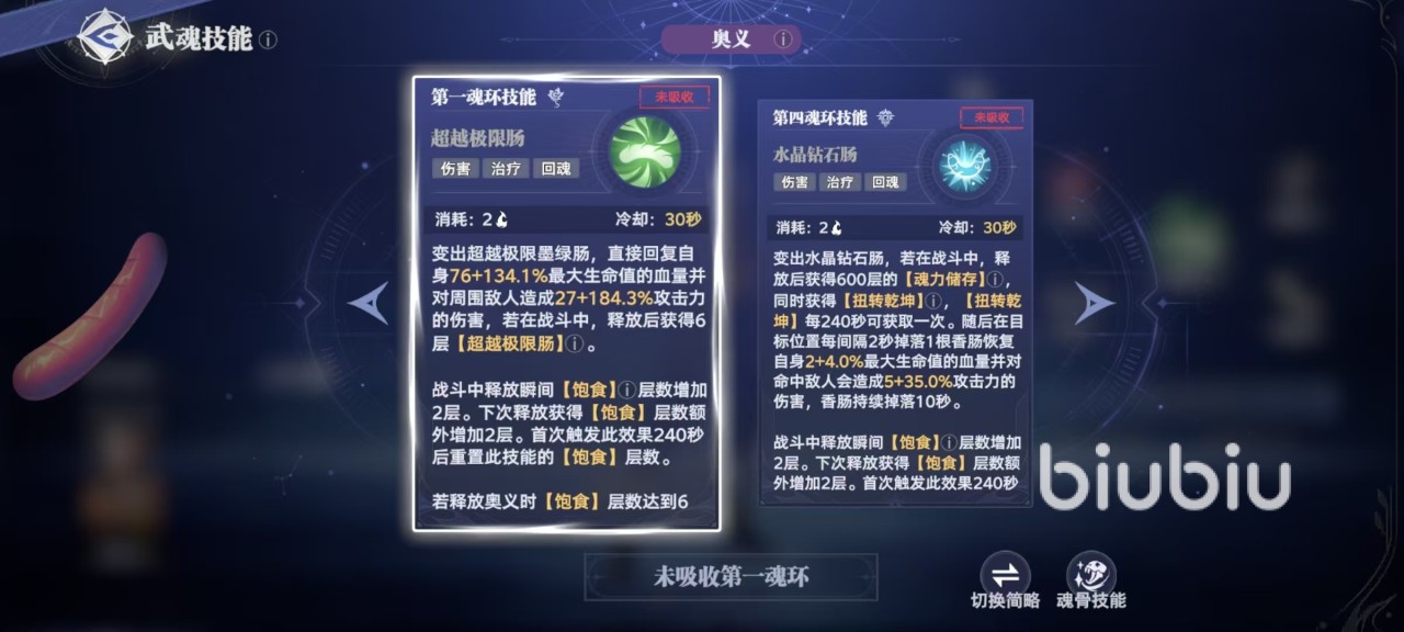 香肠的第一魂魂技,可以变出超越极限墨绿肠,直接恢复大量生命值,并对周围的敌人造成伤害,在战斗中释放后获得6层超越极限肠效果。第二魂环技能是对周围敌人造成伤害,并恢复大量魂力,如果在战斗中释放,同时可以获得辅助增伤效果。第三魂环技能是恢复小香肠,带来额外的魂力恢复,以及全体武魂持续强霸体效果等。第四魂环技能则是变出水晶钻石肠,在战斗中释放可以获得600层魂力储存效果,同时获得扭转乾坤,并在目标位置间隔2秒就可以掉落一根香肠来恢复生命值。