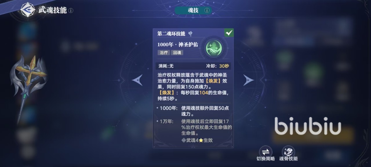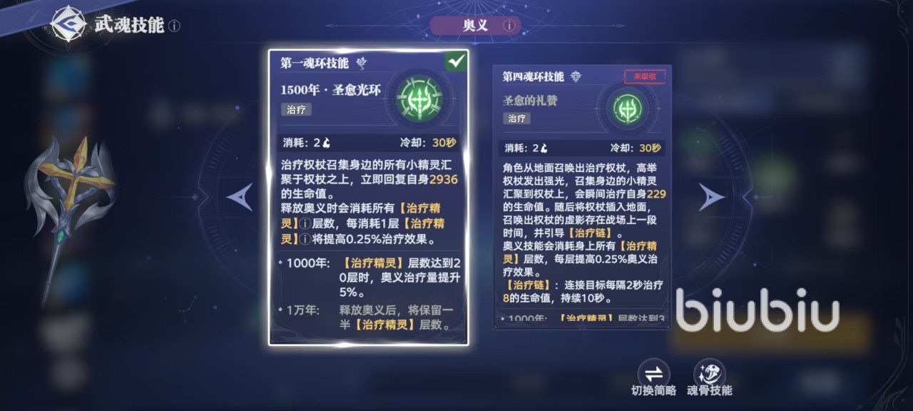 治疗权杖这个武魂本身的品级非常低,只有R级,所以很轻松就可以抽取并且培养起来。自身的第一魂环技能效果是,立即恢复大量生命值,在释放奥义时会消耗所有的治疗精灵,消耗的精灵数量越多,治疗效果也就越好。第二魂环技能是为自身施加焕发效果,恢复150点魂力,同时还能在接下来的5秒内,回复额外的生命值。