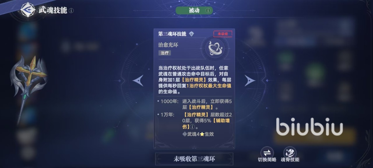 第三魂环技能是当治疗权杖处于出战时,任意武魂在普攻命中之后,都可以为自身附加一层治疗精灵效果。第四魂技则是召集身边的小精灵,瞬间对自身进行治疗并形成治疗链,连接目标每隔两秒钟就可以治疗一次。作为一个辅助型的武魂治疗权杖在加血方面绝对是非常出色的,但是在其他效果方面就比较逊色,虽然自身的第二魂环技能可以在后期获得额外的辅助增伤,但是效果依然不突出,而且需要很长的培养时间才能实现。