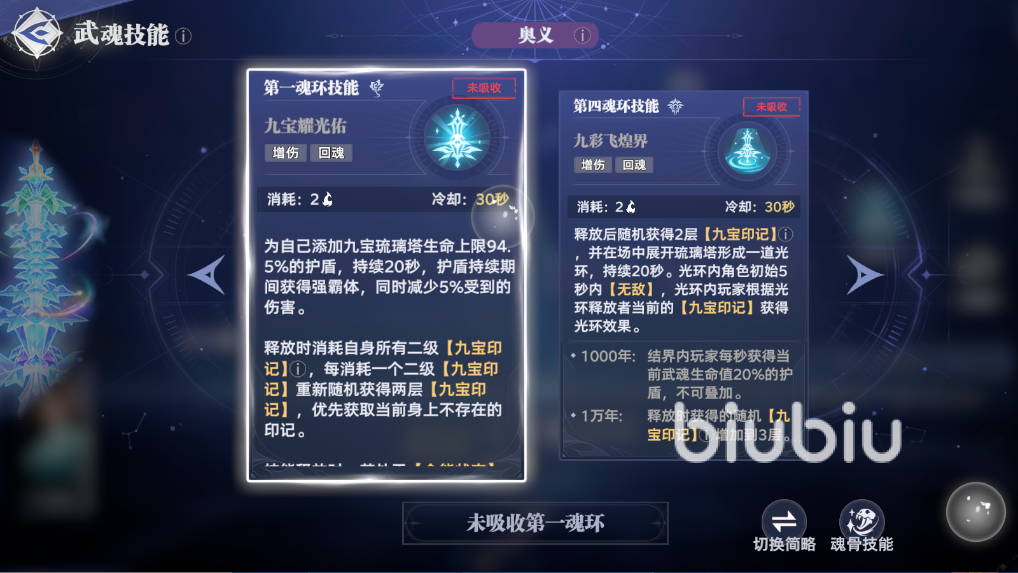 这其中九宝琉璃塔是最新的武魂,有限定抽取up,这是一个辅助系的武魂,普攻远程伤害,先机技攻击并获得一层九宝印记并升级该印记,印记的效果是6种不同属性力、速、魂、御、攻、增,其中一种并且持续2分钟。魂技则是给自己添加30秒的增伤,同时回复200点的魂力值,升级还有护盾、提升魂力恢复量、全能状态下的增伤效果。解锁被动效果后则是当获取6种不同印记后立刻将所有印记升到2级,进入全能状态。奥义则是给自身添加高额的护盾,护盾期间有霸体。也可以在解锁第四魂环后切换为生成5秒无敌光环。