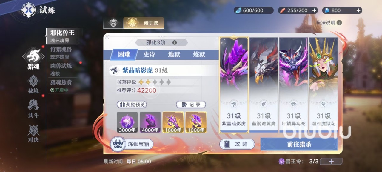 战斗时需要在限定时间内击败所有怪物和BOSS,难度越高,对输出、控制、生存的要求越大,但相应的魂环和魂骨奖励也越丰富。每天系统会免费刷新3个“兽王令”,是进入挑战的门票,建议大家合理安排时间,优先使用完这些次数。