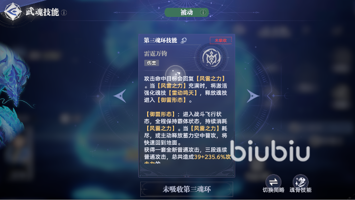 奥义是从高空砸向地面的大范围伤害,解锁第四魂环后还可以使用另一个奥义,降下数道落雷同时攻击周围目标,如果已经解锁雷霆万钧则会进入御雷形态,恢复50%的风雷之力,这个奥义还有二段,伤害倍率也很高,但使用后会立刻退出御雷形态。