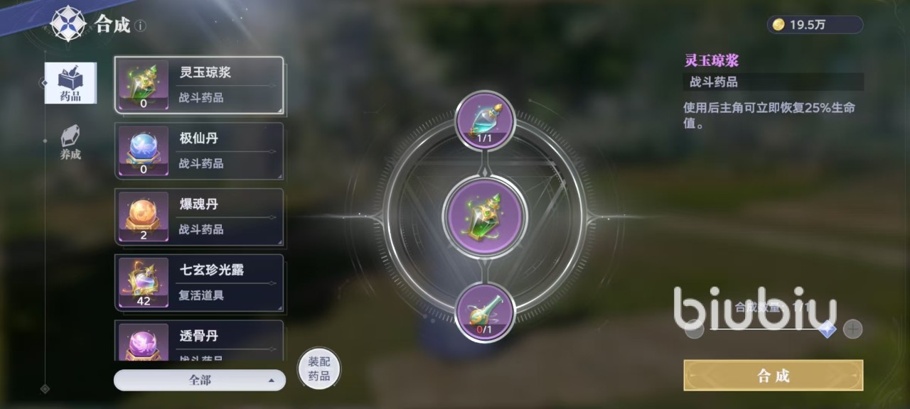 大家打开游戏页面,从中就可以看到合成功能,合成分为养成和药品这两大类。不同道具需要解锁对应的配方之后才可以进行合成,其中药品合成所需的材料,可以在世界探索采集获得。药品合成也是很多新手玩家容易忽略的地方,这里所合成的各种药品,都可以大幅度提高大家战斗中的实力。例如灵玉琼浆,可以立即恢复25%生命值,需要玉液瓶和狐尾露这两种道具来合成得到。