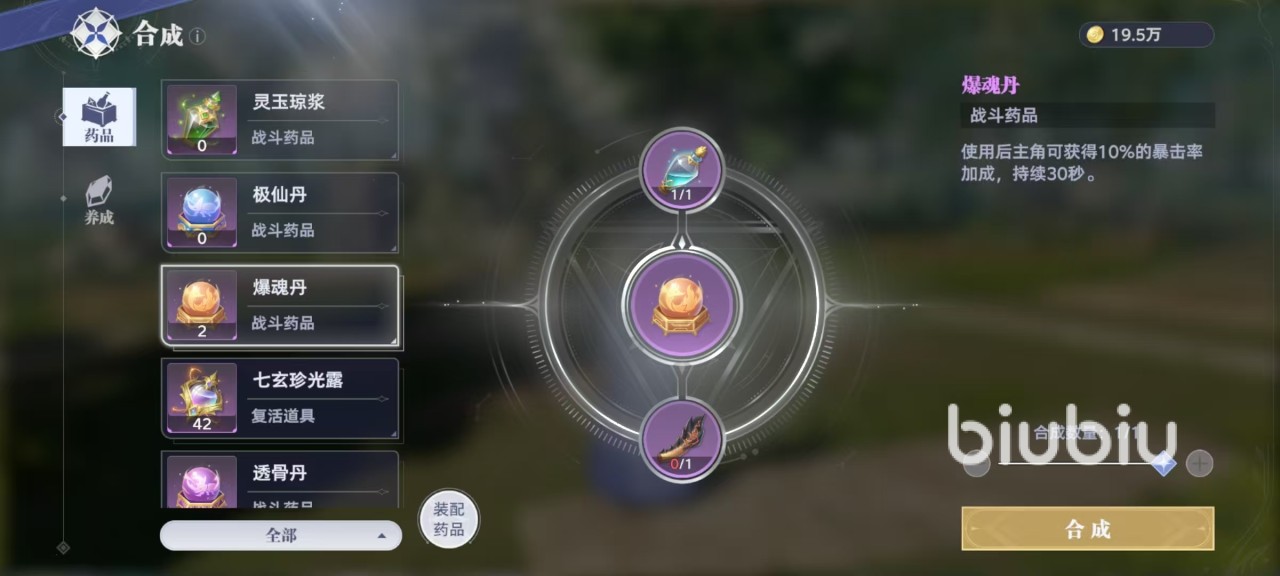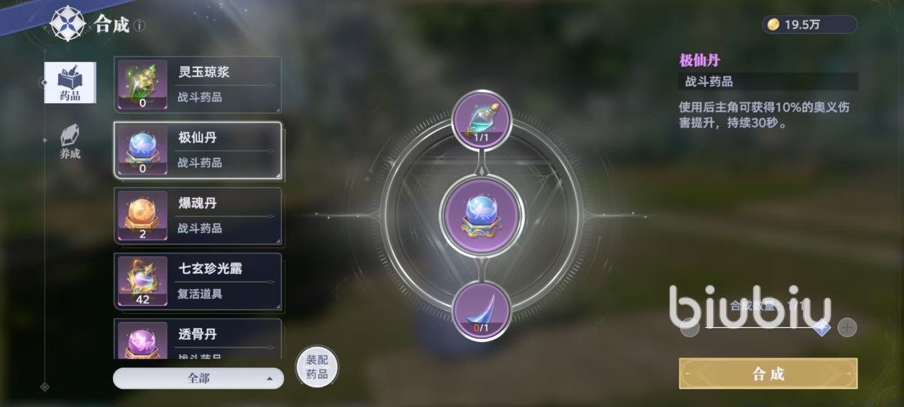 战斗中快速恢复血量,可以应对更复杂的战斗,很多玩家面对高难度战斗时,往往会出现血量不足,其实就是缺少这一类战斗药品所导致的。除了回复血量的药品之外,还有极仙丹、爆魂丹等,其中极仙丹需要玉液瓶和独角仙之角合成得到,使用后提升10%奥义伤害,爆魂丹需要玉液瓶和焰熄兽尾,使用后主角获得10%暴击率加成。类似效果的还有透骨丹,金息丹等,这些都是快速提升实力的保证,临时使用之后战力能够快速得到提升。