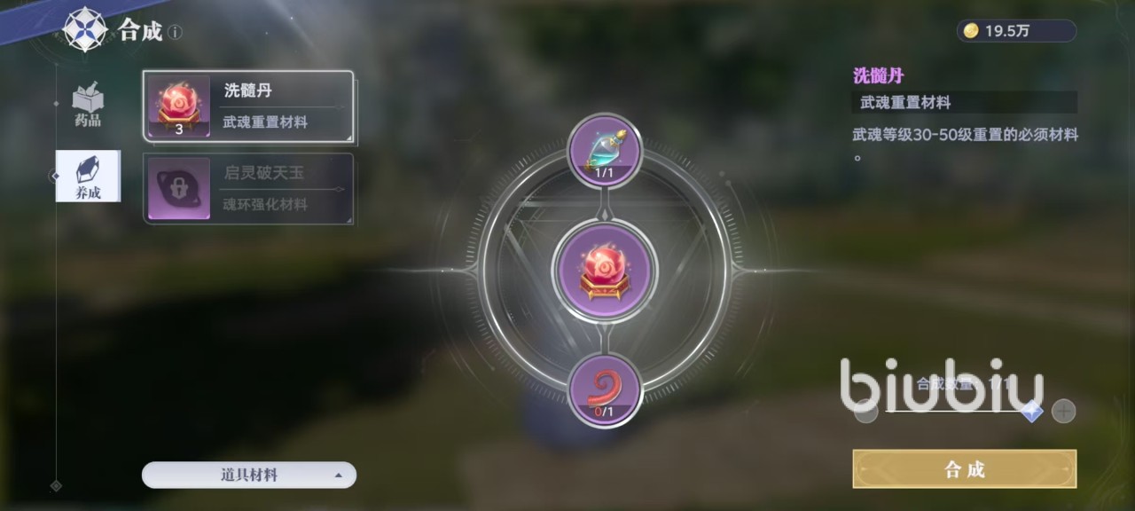 养成方面主要包括洗髓丹和启灵破天玉这两种,洗髓丹可以进行武魂重置,启灵破天玉能够进行魂环强化。大家可以通过合成功能界面直接查看这些合成选项,然后也可以看到对应材料和获取方式,这些就能够帮助大家快速合成得到这些关键的道具。这也是一定要用好合成这项功能的重要原因。