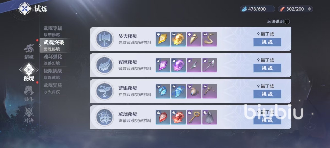 目前在游戏中开放的秘境主要包括以下几类,分别是武魂等级、武魂突破、魂环强化、极限挑战和武魂资质。其中大家最优先去挑战的就是武魂突破,武魂突破包括强攻、敏攻、控制和防辅这四大类,分别对应着对应武魂的突破材料。这项活动需要在规定时间内消灭所有的怪物就可以获得对应道具奖励,首次通关还可获得首通奖励,通过本层副本之后,就可以解锁扫荡。