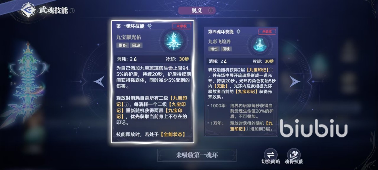 在目前游戏中最出色的辅助系武魂当属九宝琉璃塔,这是属于限定池中才会开放的武魂,实力非常强悍。九宝琉璃塔的第一魂技可以为自身添加护盾,护盾持续期间获得强霸体效果并减少受到的伤害。第二魂技是召唤出九宝琉璃塔,为自身带来增伤效果,还能够恢复魂力值,然后随机获得1层九宝印记。第三魂环技能是立即获取6种不同的九宝印记,并将所有的印记都升为2级。