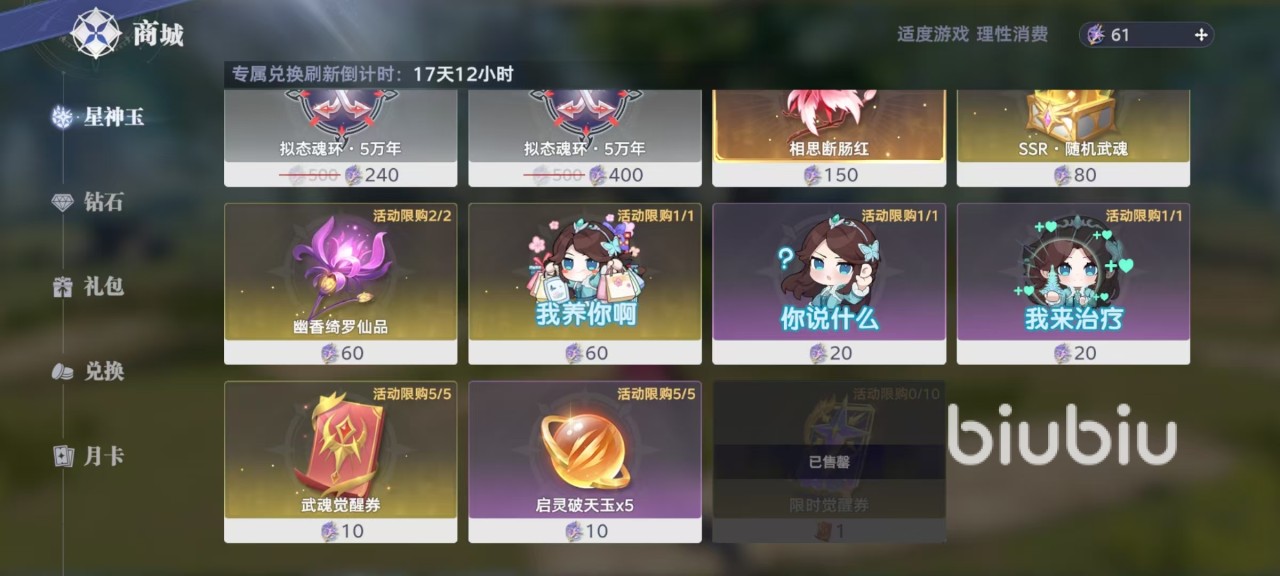 除了这些活动之外,大家也可以在大地图中进行各种探索,包括出发各种支线任务以及找到宝箱。其中高品质的宝箱就有机会开出武魂觉醒券,完成这些支线任务后,也能获得丰厚奖励。而且这些都是不需要消耗体力的,所以大家只要有时间,就可以在地图中不断进行触发,这样不需要任何充值,就能够获得足够的奖励。如果感觉还不够,可以去商城中进行购买,这款游戏并不推荐大家氪金,但是适量进行充值也有助于提升实力。商店中可以购买到武魂觉醒券,通过星神玉或者是钻石购买以及购买礼包等都可以实现。