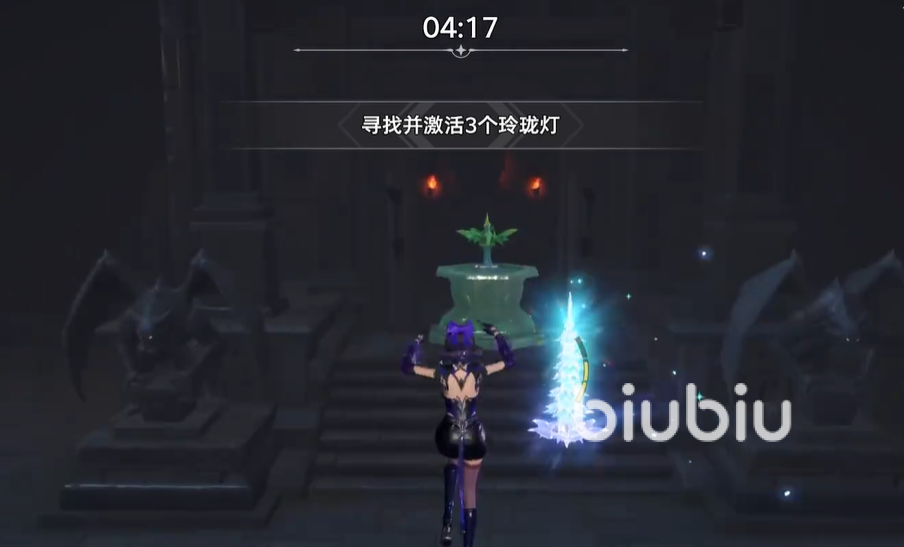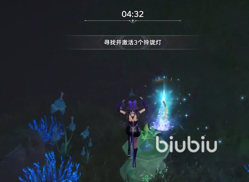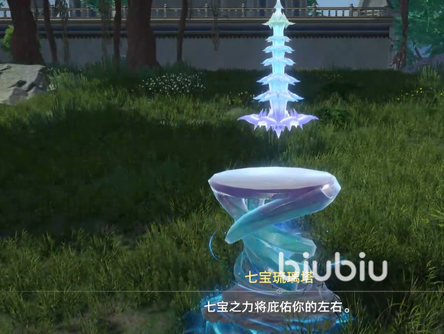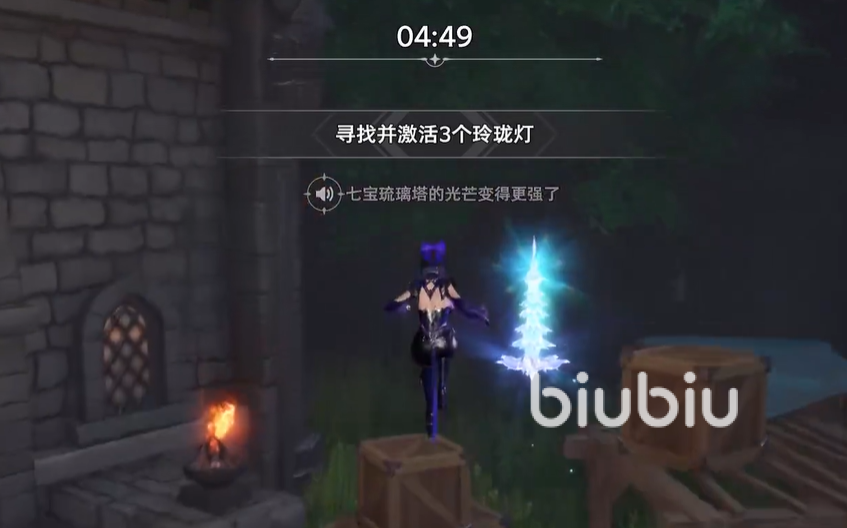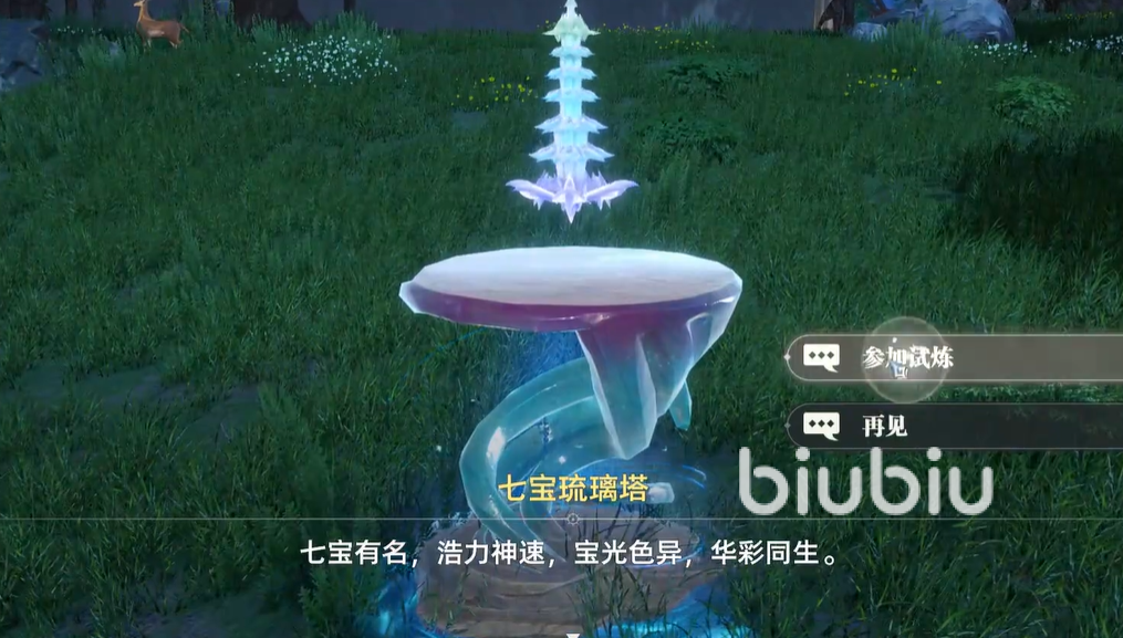首先玩家们点击草坪上的七宝塔,这时候就会跳出试炼选项,玩家们点击以后就能正式开启试炼,这个试炼的要求就是激活三个玲珑塔,而此时玩家周围会有一个比较明显的玲珑塔,这个玲珑塔的作用就是照明以及指引方向,第一个玲珑塔的方向在小屋的后面。