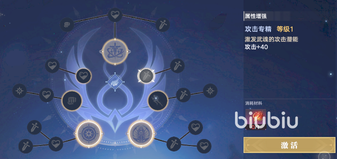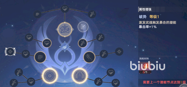 奥义专精这部分则是加大招伤害和攻防属性。除了这三大部分,还有一些加先机技伤害,加攻击力加暴击率的潜能。当然大多是线性或者分叉的,后续节点的潜能必须点出前置节点的达到一定等级后才能解锁,通常达到1级就可以了。