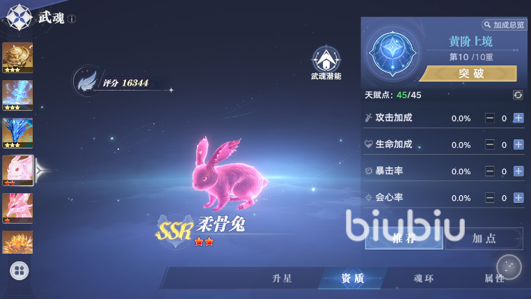 如图所示,ssr的柔骨兔是敏攻系的武魂,也就是打快速爆发输出定位的武魂,因此天赋点这里建议全都给到攻击加成,或者暴击率、会心率加成,这样带来的收益会更高。