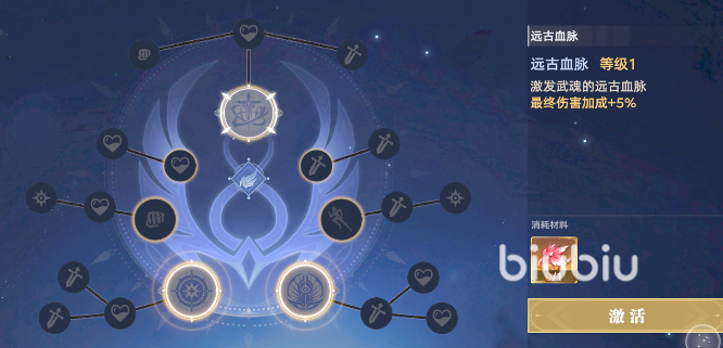 这里倾向于先把远古血脉的5%最终伤害加成点出来,这个是实打实的全面提升,然后是各个节点上的攻击力加成的,之后才是魂技、奥义、血量加成相关的。