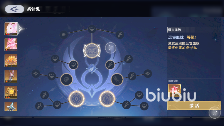 柔骨兔的武魂潜能有三大块,分别是远古血脉、魂技专精、奥义专精。血脉这一部分是增强最终伤害加成,加基础血量基础攻击力和普攻伤害强度的。魂技专精这一部分则是提升魂技(E)伤害和一些其他攻防属性的。