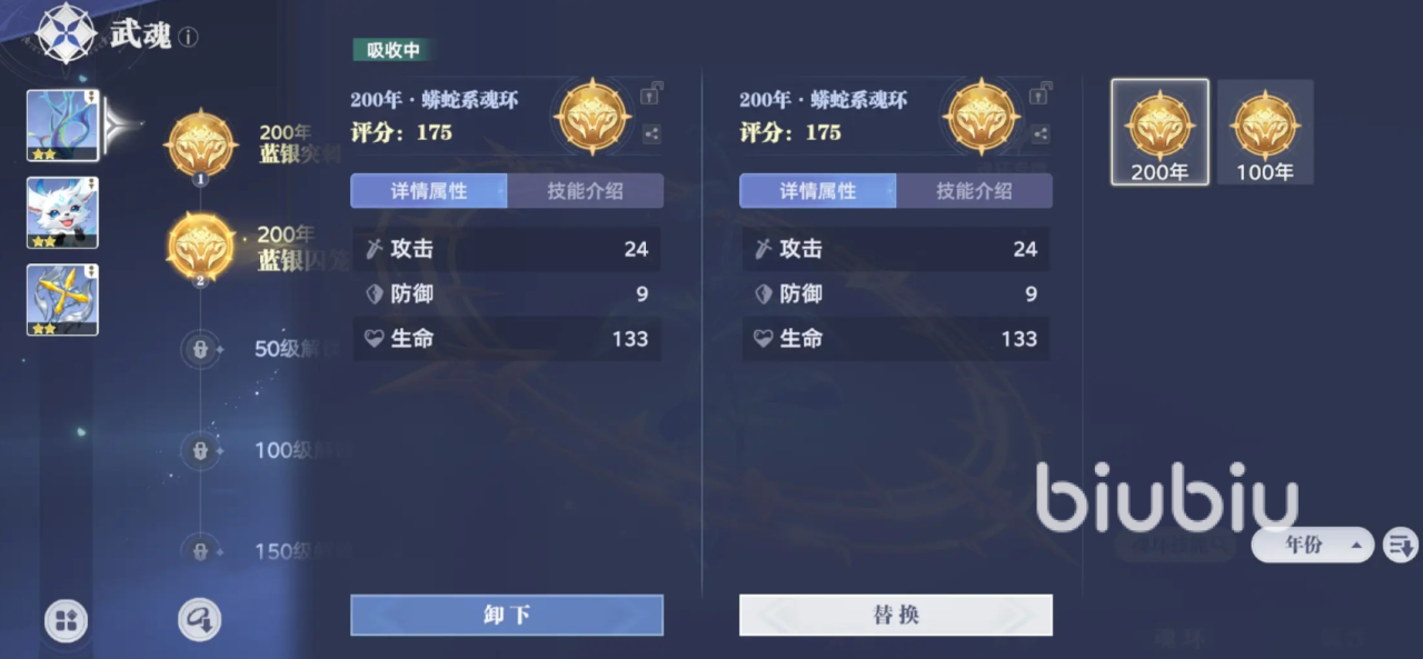 其实大家在选择蟒蛇系魂环时,自然是年限越高越好。因为年限越高的魂环所能提供的属性加成也就越高,这里200年的蟒蛇系魂环为例子,成功吸收之后,就可以获得24点的攻击力;另外还能获得高额的防御以及生命值或者魂技效果加成。