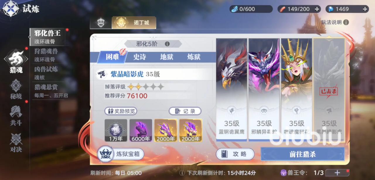 然后也可以选择挑战猎魂森林,这里的蟒蛇系魂兽会掉落对应魂环及强化材料,并且全天开放,没有挑战时间上的限制。另外也可以挑战落日森林,在这里每天刷新不同魂兽,挑战更高难度可获得高年份魂环。也可组队挑战黄金小屋二层,通关后可获得稀有魂环及材料,但需注意机关和怪物机制。