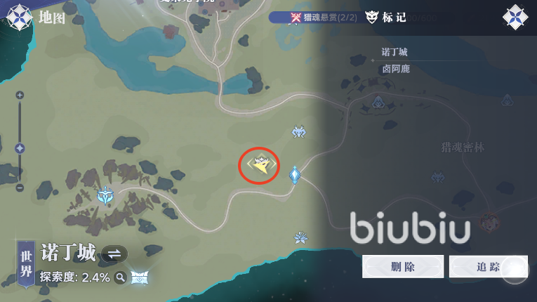 第一只是在诺丁城地图左下角,如图所示“密林西部”传送点的左侧,给大家画了一个标记,追踪这个标记的方向就能找到这只鹿了,体型很大的绿色鹿,在树林里还是能轻松发现的,击杀掉卤阿鹿之后会掉落3张武魂觉醒券。