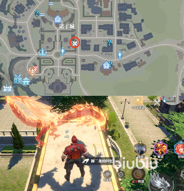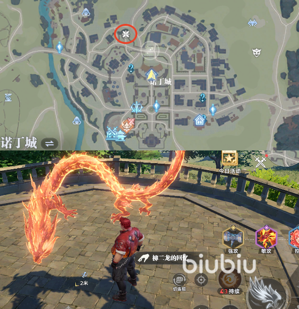 柳二龙的回忆碎片一共有6个,第一个是在诺丁城主城的左上角,如图所示可以看到一处圆台,这里用花图案给大家标记了,靠近后可以看到有一条火龙靠近互动就可以收集这个回忆。