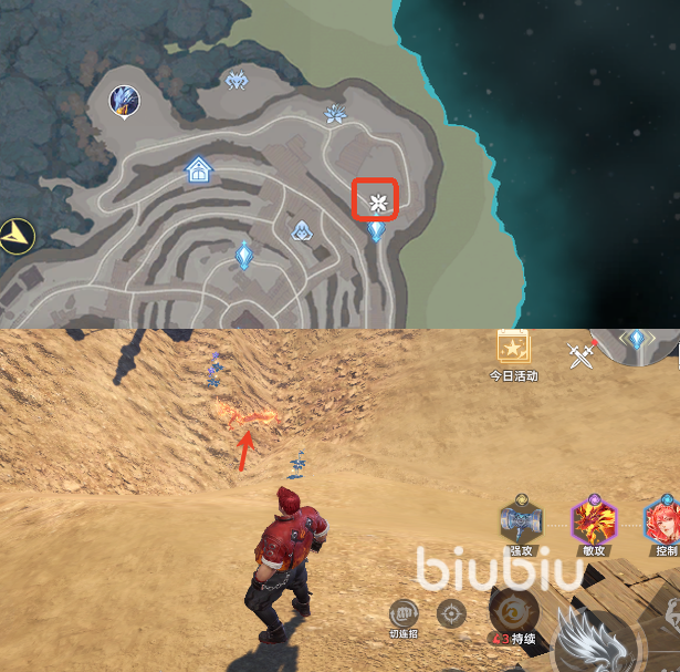第六处是在地图最右侧的矿藏区,传送点落地后掉头向着矿坑内走,滑下去就可以看到火龙,这里还有一些植物材料可以顺带采集下。