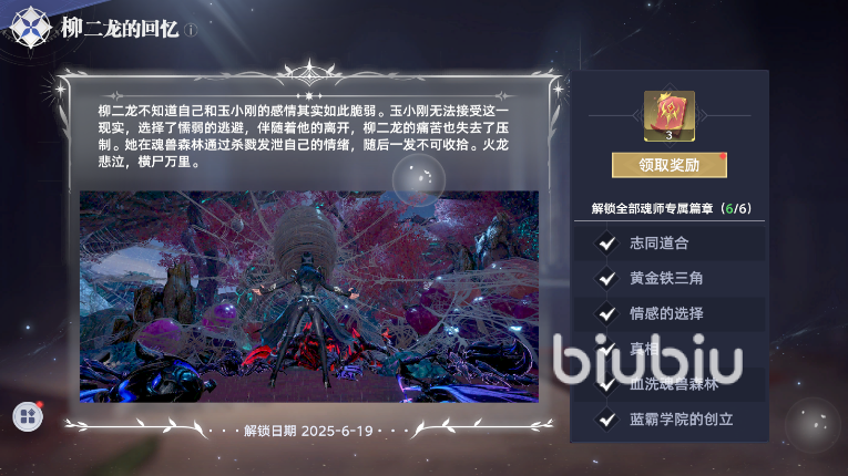 至此斗罗大陆猎魂世界魂师篇章探索之柳二龙篇就结束了,收集这6个回忆之就可以在设置-魂师篇章中解锁柳二龙回忆的名字,6个回忆全部解锁就可以获得武魂觉醒券奖励了。