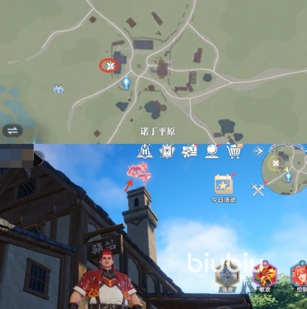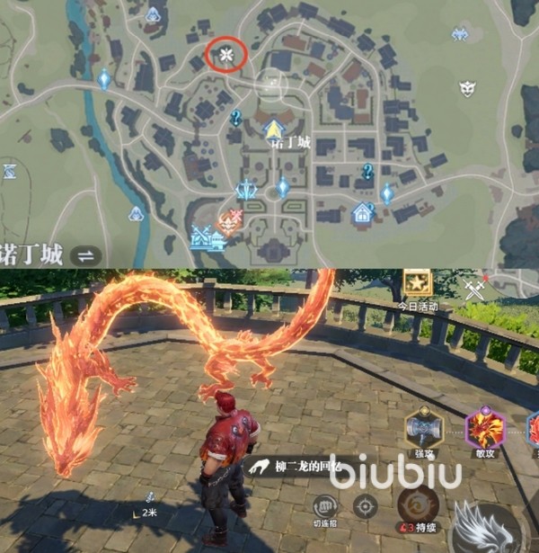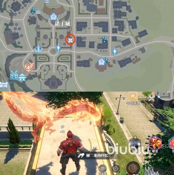 第一个回忆碎片是在诺丁城主城左上角的圆台区域。靠近圆形高台时会看到一个火龙标记,走近后即可进行互动收集。可以参照图中圈出来的地方,整个区域地势开阔,还是很容易抵达的。