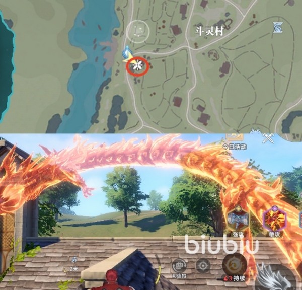 第五处碎片在斗灵村附近房屋的屋顶上。传送至斗灵村后,向前略微探索,即可在某栋民居顶部发现火龙回忆点。这个碎片很显眼,是六个碎片中最容易找到的。