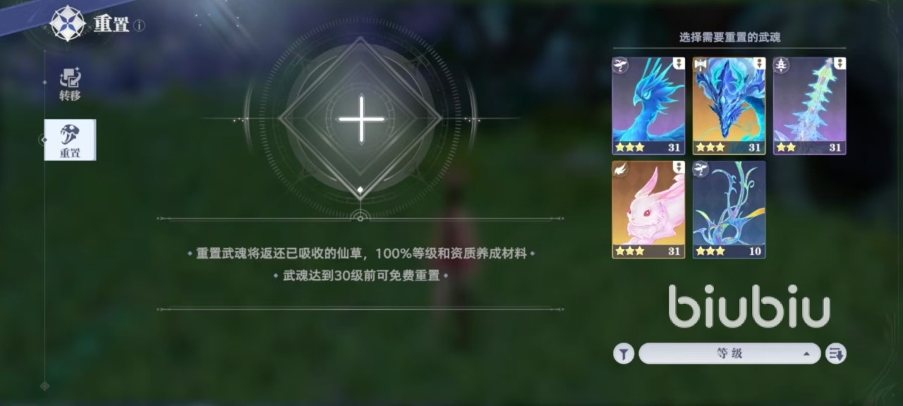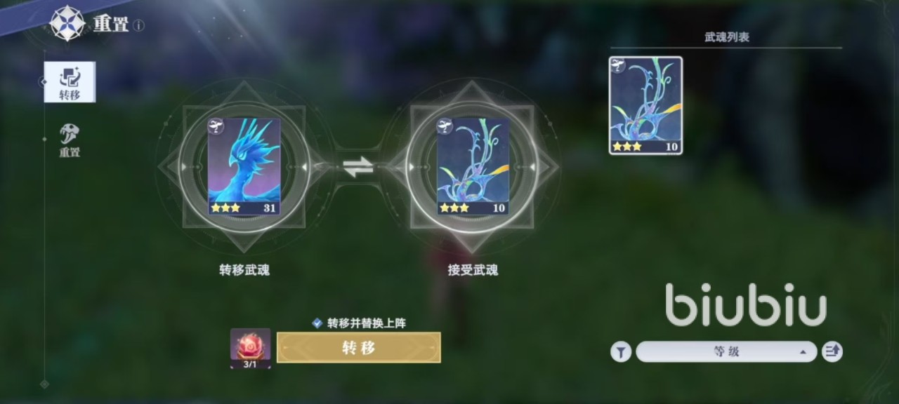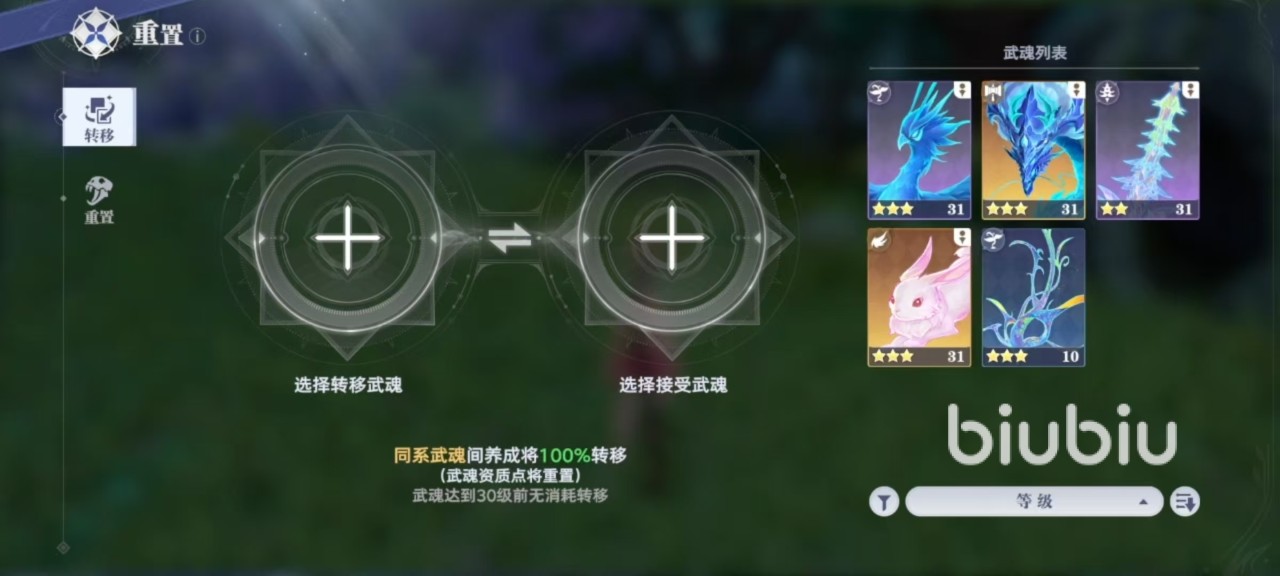这里要注意必须是同系的两个武魂之间才可以转移,例如强攻系武魂,只能转移给强攻系,而不能转移给敏攻系或者是控制系等,其他系的武魂也是如此。武魂重置是将武魂已经培养的内容直接归零,将资源进行返还,包括仙草、等级材料、资质材料等,都能够做到全额返还,在达到30级之前可以免费重置。具体的操作就是选择转移,然后再右侧可以看到当前的武魂列表,将需要转移的两个武魂放上去点击,就可以直接转移成功了。重置也是如此,将需要重置的点击选择出来,然后就能够直接重置到位。