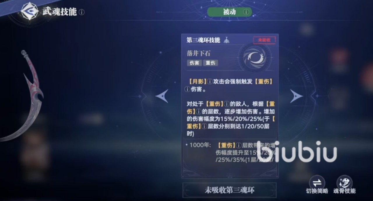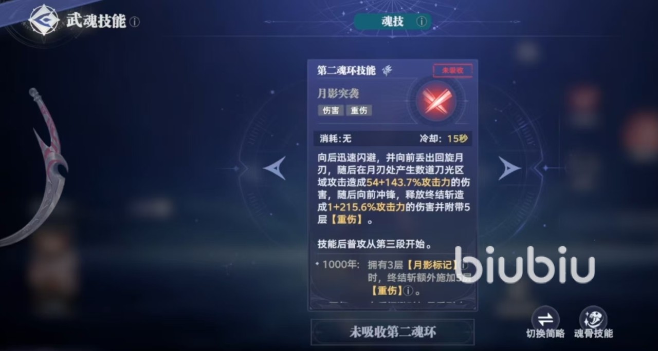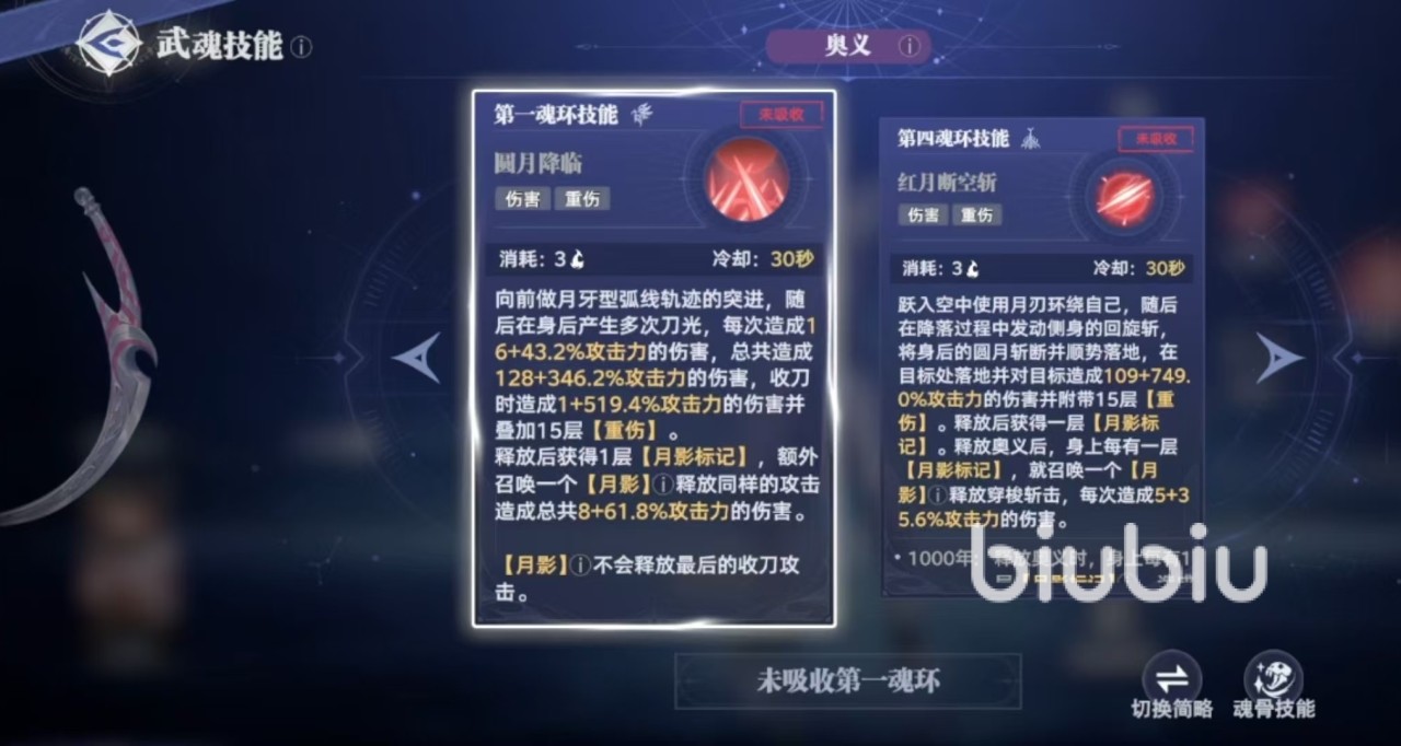 在释放第二魂环技能之后,接上普攻是从第3段开始,所以一定要注意穿插普攻,打出足额伤害。第三魂环技能使得月影会强制触发重伤伤害,对于处于重伤状态的敌人,会根据重伤重数逐步增加伤害。第四魂技可以跃入空中,召唤出月刃环绕自身,在降落过程中发动侧身的回旋斩。在目标处落地,对目标造成伤害和附带的重伤效果,释放之后获得一层月影标记,身上每有一层月影标记,就可以召唤一个月影。