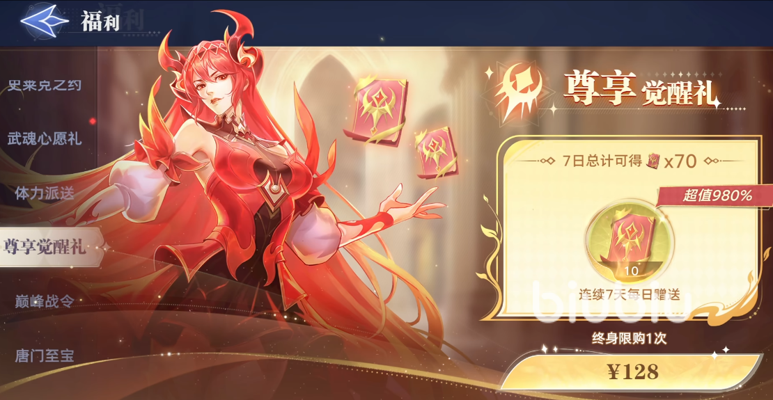 游戏中还有比较重要的氪点,就是价值128元的尊享觉醒礼,这个礼券是终身制的,每日上线能领取到10张的觉醒券,可以连续领取7天。