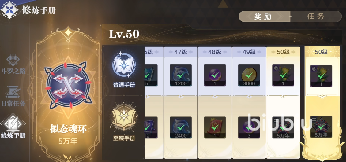 游戏中的修炼手册也是很重要的氪金点,这个氪金项目价值68元。修炼手册相当于等级内容,达成领取的等级条件就能获得相关的道具奖励,这些奖励对于游戏初期的玩家来说也是很重要的资源道具。在修炼手册的奖励中,当玩家等级达到50级,能获得5万年的魂环。