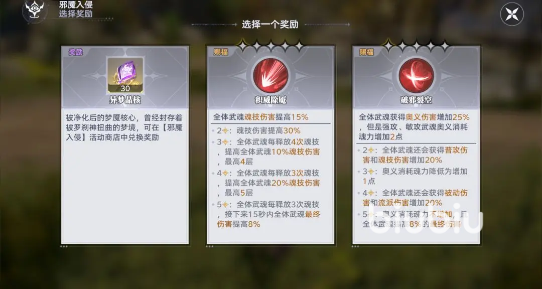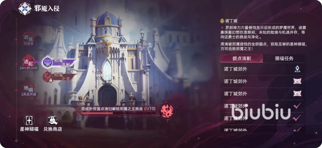 邪魇清剿:每个轮次开启时,邪魇会随机入侵大家已经探索过的大陆,10个邪魇将分布大陆不同位置,等待大家前往清剿,每次都不消耗体力和道具,轮次期间能自由尝试,被击败可消耗道具复活2次;清剿成功能从少量“异梦晶核”和2和“神遗赐福”选择1个获得。