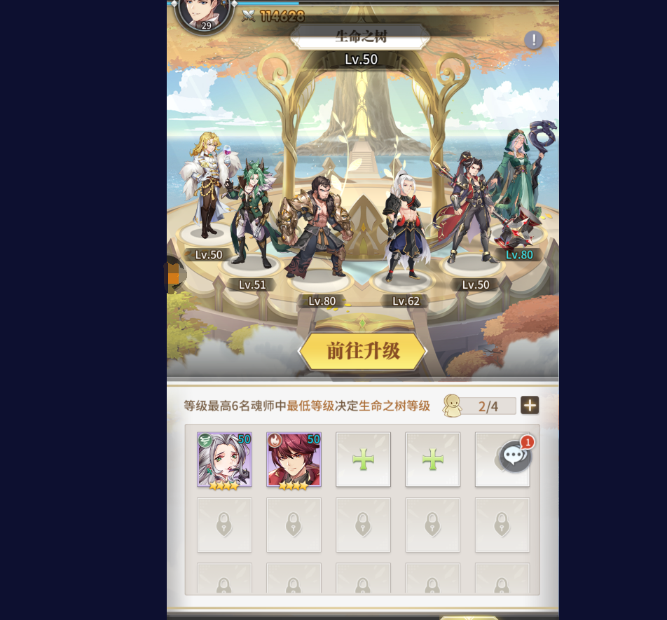 而生命之树下方的槽需要生命之木才能解锁,生命之木需要在时间之门中获得。所以我们要想提升生命之树的等级,那么就必须将生命之树上的六位魂师的等级提升。小编建议大家尽量去上一些星级高的魂师,因为星级越低魂师的等级上限就越低。