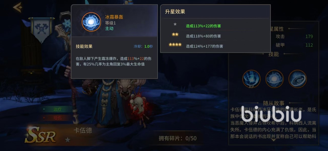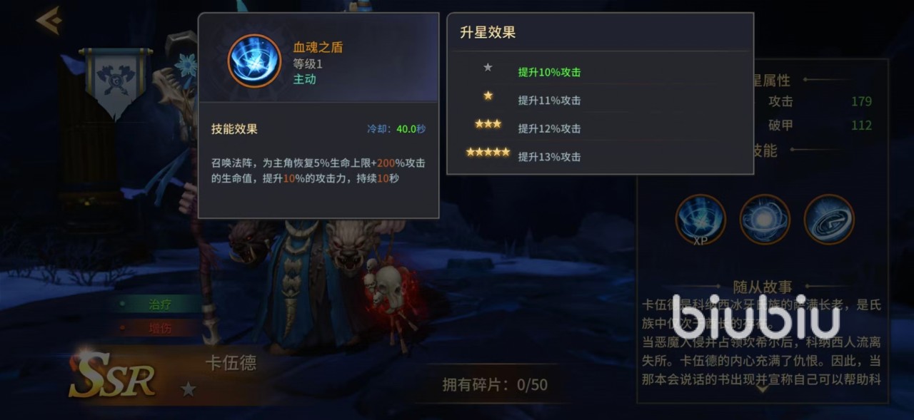 在技能方面,第一个技能效果是在敌人脚下产生爆炸,造成伤害后有25%几率给主角回复3%最大生命值。技能升星之后仅提高伤害,回复依然不变。二技能是召唤法阵对敌人造成伤害后,给主角回复400%攻击数值的生命值。大招是召唤法阵,给主角恢复5%生命上限和200%攻击力数值的生命值,并最多提升13%攻击力。持续10秒钟。三个技能全都有加血治疗效果,是这个伙伴非常有价值的地方,再加上提供了高达10%的攻击力,在队伍输出方面也有很强增益效果。这是因为这些技能都很有用,所以这个伙伴出场几率很高,几乎可以搭配任何阵容和任何职业,卡伍德提供的治疗能力能够大大增加生存。