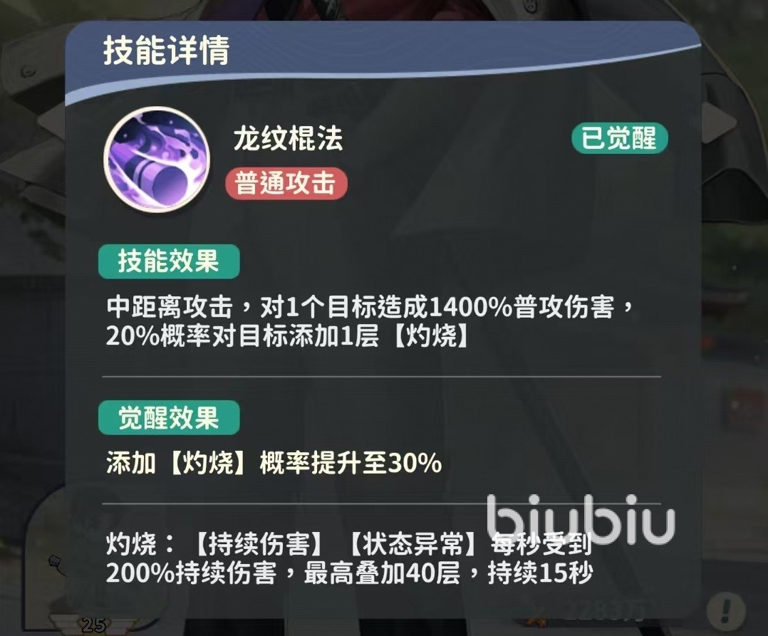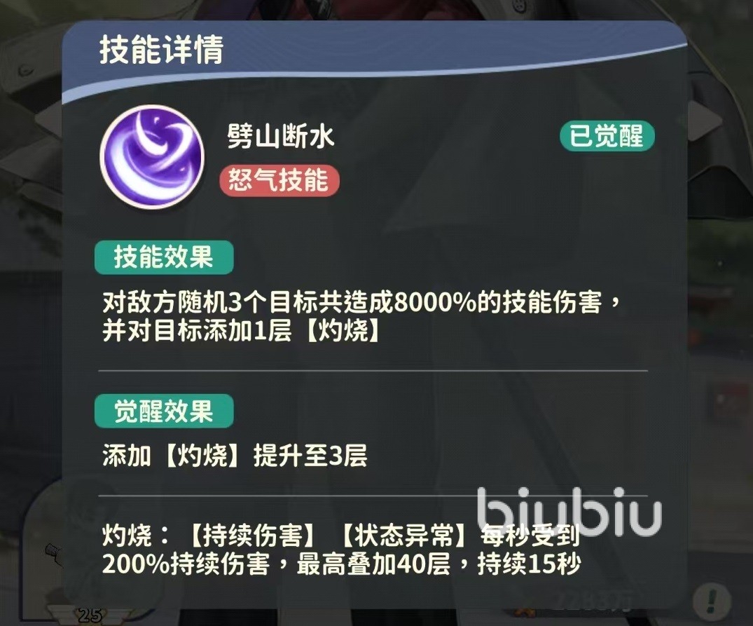 解雨臣的普攻龙纹棍法,中距离攻击,可以对目标造成高额普攻伤害,并有20%的几率对目标添加1层灼烧,在觉醒之后,灼烧的附加几率可以提升到30%。灼烧这个效果是属于持续伤害和异常状态,使对方每秒钟受到持续伤害,最多可以叠加到40层。主动技能劈山断水,对敌方随机三个目标造成高额技能伤害,并对目标添加1层灼烧,觉醒之后灼烧效果可以增加到3层。