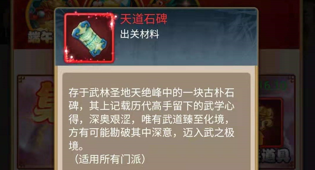 天道石碑属于消耗类道具,这一点和武林秘籍于装备不同,所以获取的途径也不同,一般的盟主宝箱是开不出来的,目前获得天道石碑最重要的途径就是节日活动的时候来获得。例如最近的端午节活动中就出现了天道石碑,而且一般都是出现在节日活动的最后阶段,而且出现的时间很短,只有一天时间。